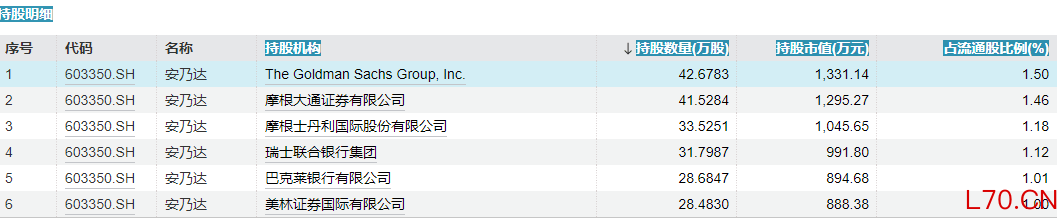 从持有的QFII数量看,安乃达最受青睐,包括高盛、摩根大通证券、摩根士丹利国际、瑞士联合银行集团、巴克莱银行、美林证券等6家QFII在三季度新进,并一举成为该公司的前六大流通股东。据悉,安乃达今年7月3日在上交所上市,是一家专业从事电动两轮车电驱动系统研发、生产及销售的高新技术企业。9月24日~10月31日,安乃达的股价区间涨幅超过24%。