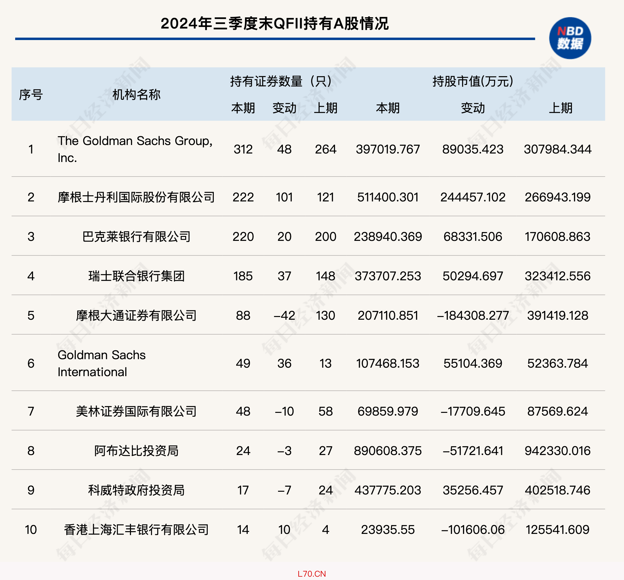 三季度末,高盛(The Golman Sachs Group,Inc.)进入前十大流通股东名单的A股证券数量增加了48只,达到了312只。