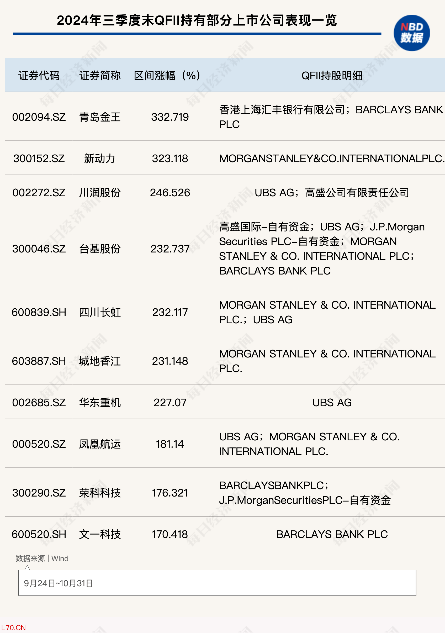 数据显示,QFII三季度共计持有760只个股,9月24日~10月31日,共有31只个股的涨幅超过100%。青岛金王、新动力和川润股份等市场大牛股,QFII都已在三季度潜伏其中。