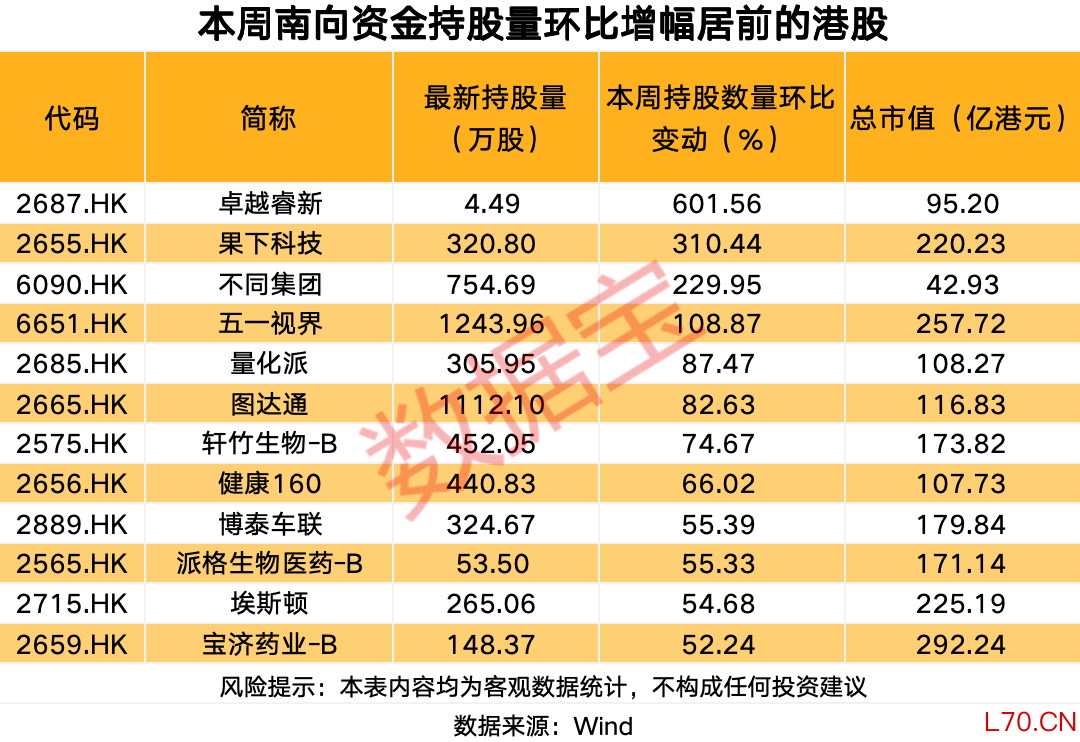 本周12股获得南向资金持股量环比增长超50%。